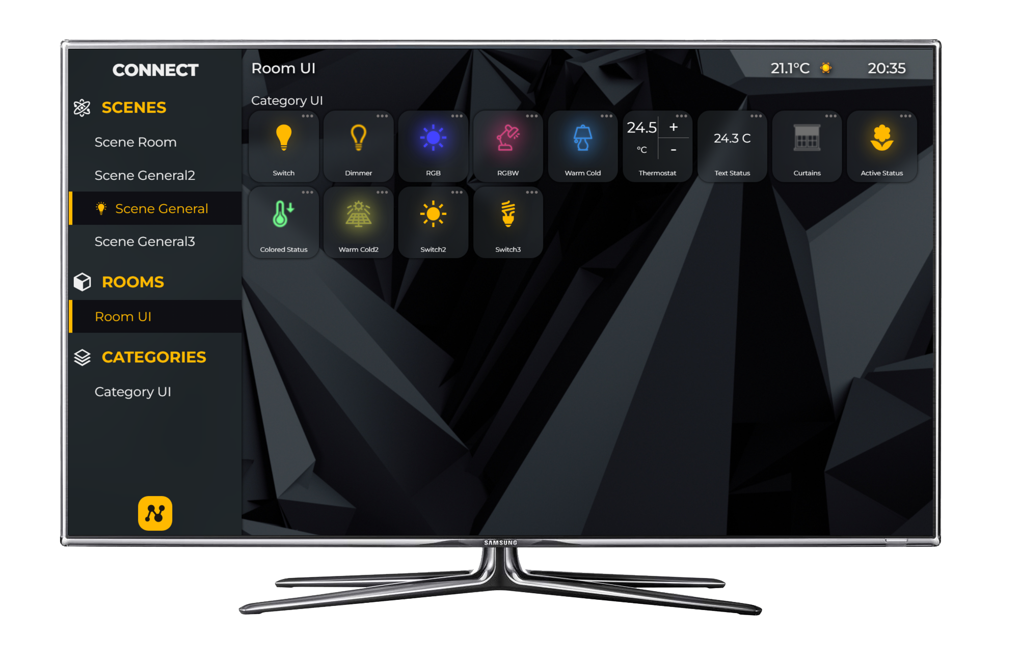 6. реализованы режимы сценариев, сервис отображения погоды, переключатели, плавная регулировка яркости и цвета освещения, функционал термостата с поддержкой системы кондиционирования, всплывающие информационные сообщения